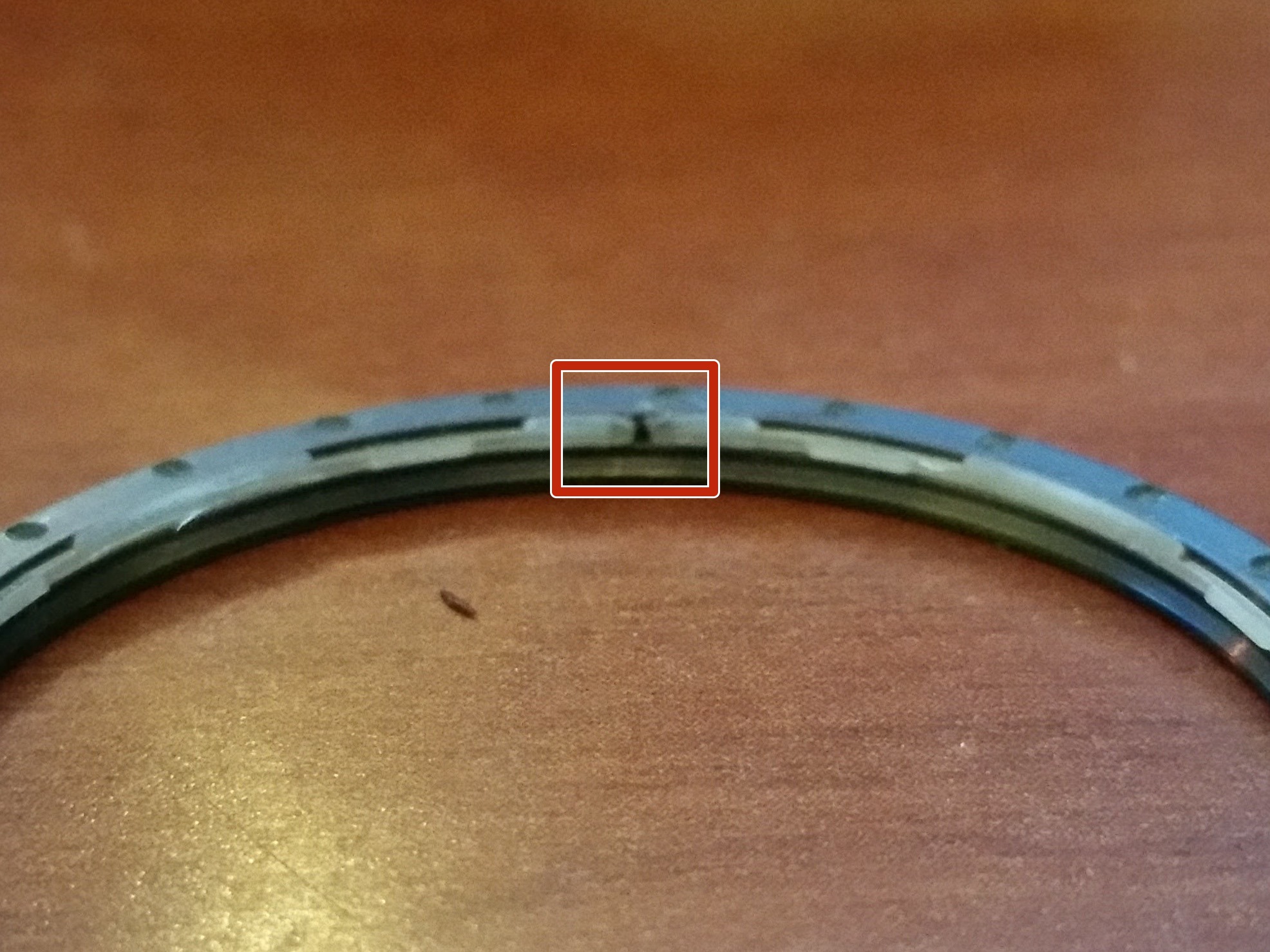 Once you have the retainer seated in the bezel, place the bezel face down on your watch face placing the side with the split in the retainer down first. If you do not do this, the retainer may not seat properly, as shown in the first photo.